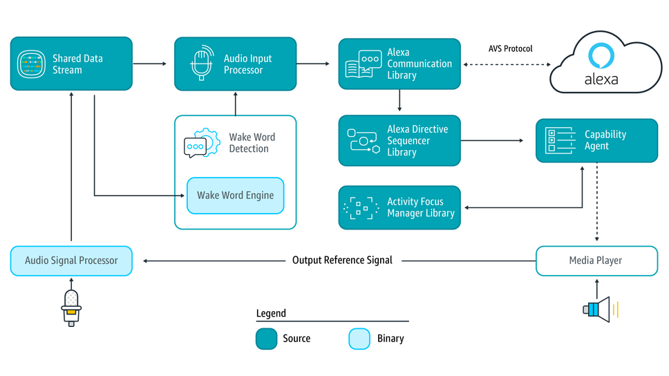 Audio Signal Processor(ASP)とよばれる、マイクから入力した音源のエコーキャンセル(AEC)や複数マイク用の制御などを行うソフトウェアや、「alexa」という呼びかけに使われるWake Word Engine(WWE)など、サードパーティ製の物を含む様々なライブラリが公開されています。