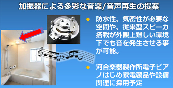 また、同社は、浴室で音楽を聴いたり、キッチンで音楽やTV放送を楽しんだり、あるいはインターフォンにおける音声など、住宅内のあらゆる場所で今後ますます「音」を活用するシーンが増えてくるであろう今後の展開に対し、防水性や気密性が必要な空間や、壁埋め込み、天井埋め込みなど、従来型スピーカーの搭載が外観上難しい環境下でも音を発生させる事が必要となっていくと予想している。