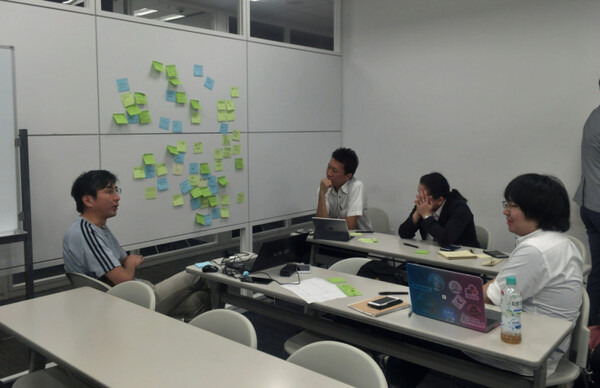 ブレストについても注意点を教えて頂いた後、グループに分かれて実際に行います。今回は時間が限られた中での簡易的なブレストを行いました。