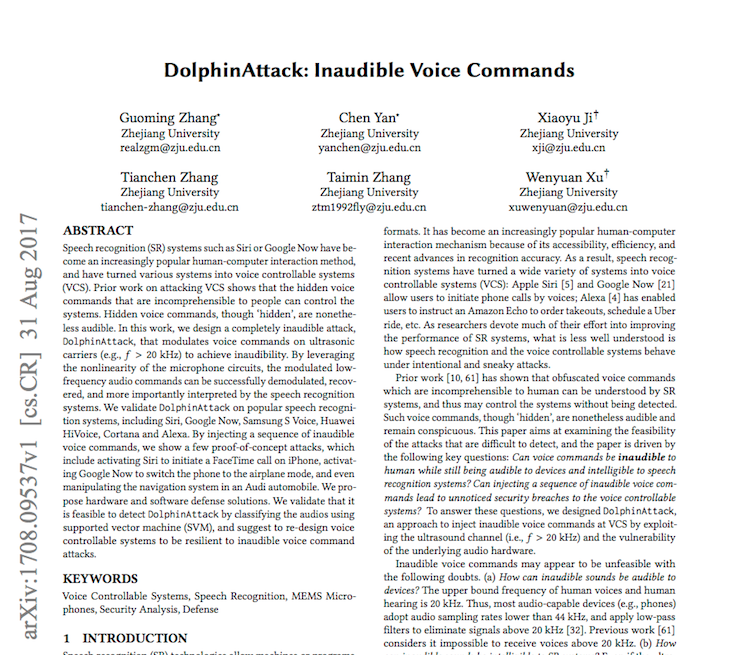 中国の浙江大学の研究チームがAI音声アシスタント搭載のスマートフォン・スマートスピーカーについて人間に聞こえない音声コマンド(Inaudible Voice Commands)で操作できることを示す論文を発表した。