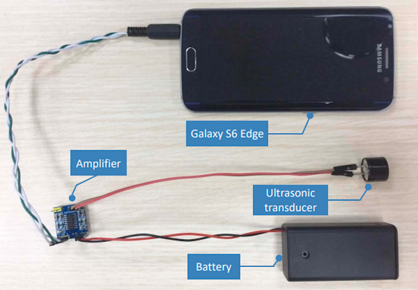 論文では、Samsungのスマートフォンにアンプとウルトラソニックトランスデューサー、バッテリーを組み合わせた装置で実験を行っている。スマホ以外では3ドルしかかかっていないという低価格なハード構成で実験可能という。