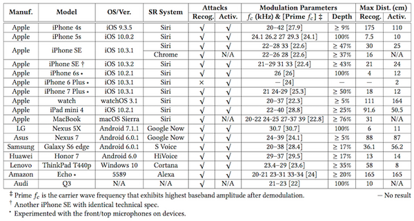 結果、ドルフィンアタックは、iPhoneやAmazon Echoなど、16種類のハードウェア、7種類のAI音声アシスタントで操作できることが明らかとなった。