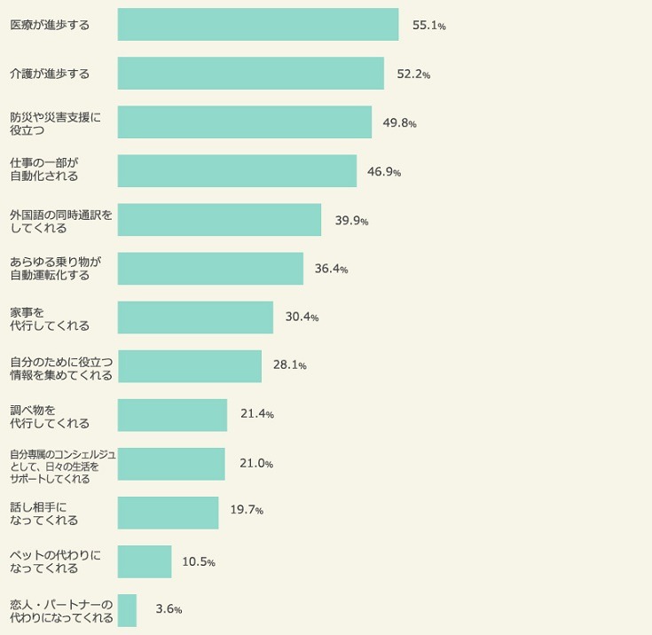 AIに対して期待することに関しては、1位「医療の進歩」55%、2位「介護が進歩」52%、3位「防災や災害支援」50%と医療・介護・防災がトップ3となった。4番目には「仕事の一部が自動化される」47%が続く。