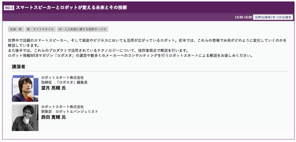 また、「世界の注目を集めるスピーカーが集合」として各種コンファレンス(カンファレンス)も開催され、10月4日 13:30~15:00には、ロボットスタートからロボスタ編集長の望月亮輔と、ロボットエバンジェリストの西田寛輔が登壇し、講演「スマートスピーカーとロボットが変える未来とその技術」が行われる。