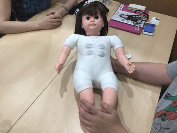 このロボットの名前は「桃色花子」で、愛称は「はなちゃん」といいます。身長は58cm、おもさはだいたい1Kgくらいです。