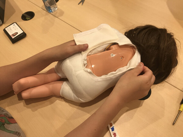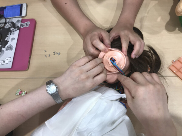 首のとこハサミで切りましょう。そしたら、顔が全部めくれるから、頭の中が見られます。