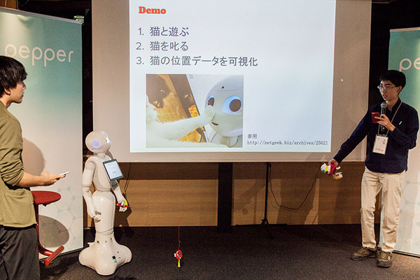 「猫カフェ」でスタッフの代わりに、Pepperが猫のしつけ・猫との遊び及び判別を行う作品。猫が侵入禁止エリアに入るとPepperが注意したり、猫がPepperに近づくと、手につけた猫じゃらしで遊んであげるなど。Cognitive Servicesを使い、Pepperのカメラで撮影した部屋の写真から、猫の種類やいる位置を特定することもできる。