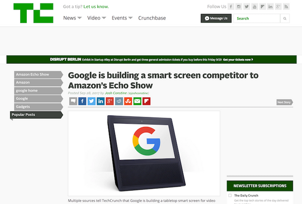 9月28日、「GoogleがAmazon Echo Show対抗のディスプレイ搭載スマートデバイスを開発中」とTechCrunchが複数の情報源から得た情報として報じた。