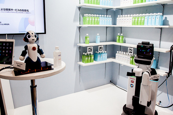 会話が得意のロボットと、移動してモノをつかむことができるロボットが、それぞれ得意なスキルを活用し、連携して接客を行うというものだ。