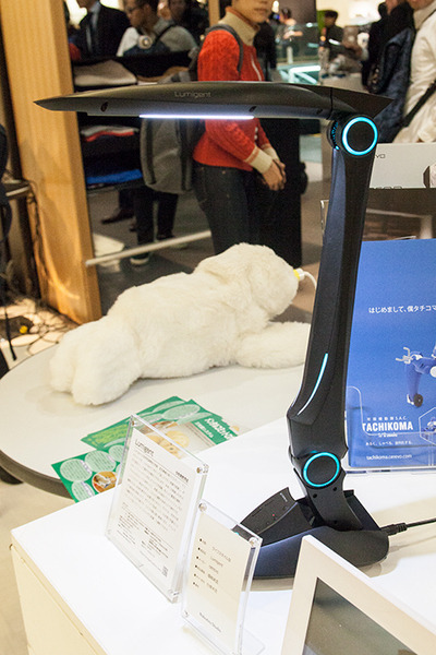 Cerevoの「1/8 タチコマ」やロボットデスクライト「Lumigent」、ダンスを踊る「NAO」「プリメイドAI」「Alpha1 pro」、大きいロボットでは衣類を折りたたんで仕分けする「ランドロイド」が目を引く。
