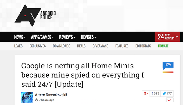 サンフランシスコで行われたMade by Googleのイベントで入手した「Google Home Mini」が1日に数千回アクティブになりGoogleのサーバーと通信していることに気がついたという。