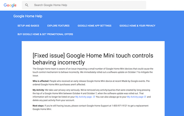 Google Home Helpページでは、10月7日のソフトウェアアップデートで対策済みと発表している。このアップデートでも問題が解決しない場合は本体を交換するとのこと。