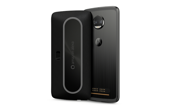 スマートフォンの「Moto Z」組み合わせて、背面に装着して使う。これにより自由に持ち運べるAmazon Alexaデバイスとなる仕組みだ。