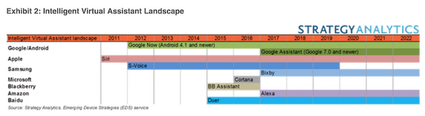 今年世界中で販売されたスマートフォンの3台中1台が人工知能によるバーチャルアシスタントを搭載している状況で、現在300ドル以上のスマホの93%に搭載、2020年には100ドル以上のスマホの80%に搭載されるという。