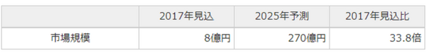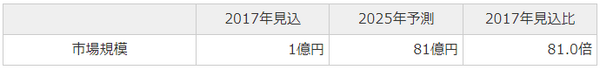 AIを活用した業務・産業向け省エネサービスや太陽光発電O&Mサービスを中心に採用率が高まり、市場は2025年には2017年の見込値と比較して169.0倍を予測している。