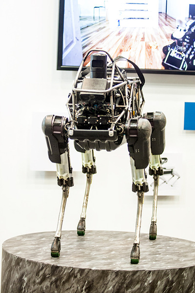 この動画に出てくる人型のロボットが「アトラス」。そして以下の画像の犬型のロボットが「スポット」だ。開催中のSoftbank Robot Worldの展示ブースで飾られている。