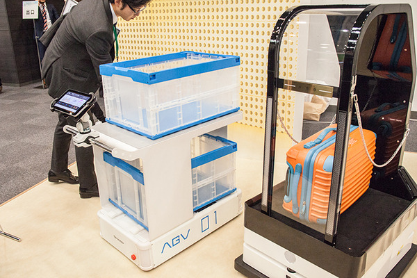シャープは自動運搬装置「AGV」を展示していた。ハウステンボスの「変なホテル」で活躍しているポーターロボットと、物流倉庫などでスタッフの運搬を自動化する「AGV」(Automatic Guided Vehicle)だ。ポーターロボットは宿泊客がロビーで荷物を乗せて、タッチパネルディスプレイや音声で部屋番号を指示すると自動的に客室まで荷物を運びながら案内してくれる。物流倉庫向けのAGVは、オリコンの運搬タイプ、リアカーの引っ張り牽引タイプ、潜伏牽引型カゴ車配送タイプ等が用意されている。ソフトバンクとシャープのAGVは、現状では特にビジネスで深い関係にあるわけではないが、今後は連携したビジネス展開によって、移動可能なロボットの普及が期待できるかもしれない。