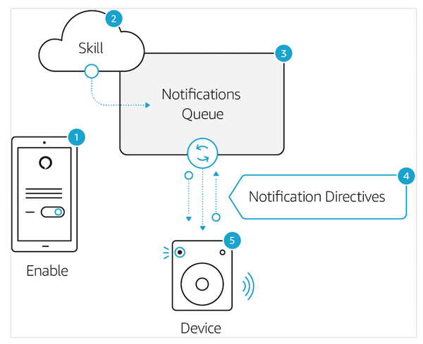 通知機能は、Alexaユーザーがオプトインしたスキルに限って。ユーザーに対して通知を行えるようになる機能だ。通知がある場合、サウンドとデバイスのLEDのインジケーターで新しい情報があることをユーザーに伝えることができる。