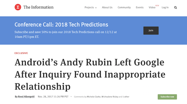 The Information / Android’s Andy Rubin Left Google After Inquiry Found Inappropriate Relationship