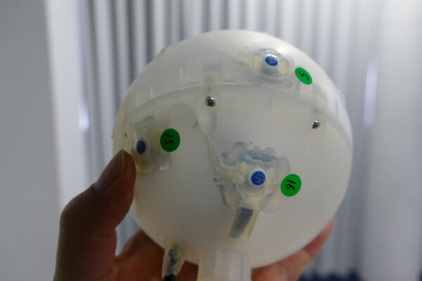 また三次元音源位置推定と地図表示技術によって音源を操作者にもわかりやすく可視化するインターフェースを開発した。ドローンへの設置を容易にするためにケーブル1本でまとめて接続できる16個のマイクロホンからなる全天候型マイクロホンアレイを開発。雨天時でも捜索が可能になった。下記の動画で青い丸で示されるのが声を出した人の位置だ。