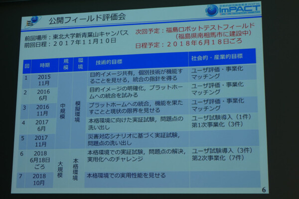 ImPACT TRCでは年に2回、大規模なデモンストレーションとして、公開フィールド評価会を行なっている。次回は2018年6月18日ごろを予定としている。場所は福島県南相馬市に建設中の「福島ロボットテストフィールド」。