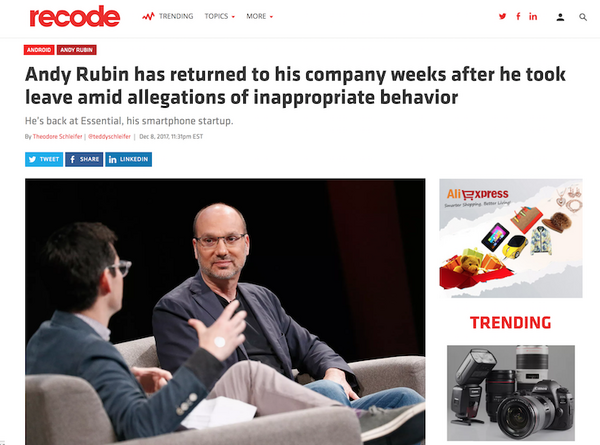 2017年12月8日、recodeがAndroidの生みの親、Essential ProductsのCEOであるアンディ・ルービン氏の休職からの復帰を報じた。
