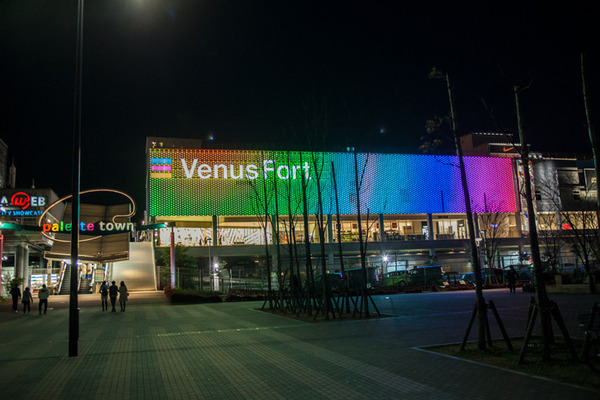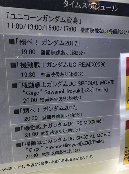 ダイバーシティ東京の壁に作品のダイジェスト映像等が映し出され、映像にシンクロして別のカラーに発光するユニコーンガンダムも見られます!