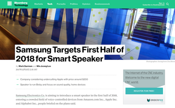 韓国サムスンが自社AI音声アシスタント「Bixby」搭載のスマートスピーカー(AIスピーカー)を準備中であるという噂は以前より続いているのだが、今回また新たにBloombergが発売時期やコンセプトの噂を報じた。