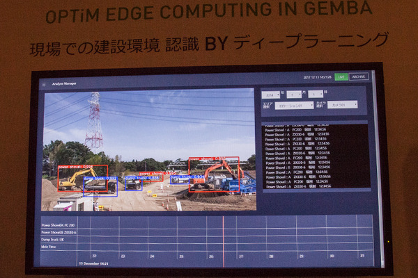 ひとつは工事現場の監視だ。GTC Japan 2017のコマツの展示ブースでは、固定カメラから現場を写し、そのフレームの中でダンプトラックやパワーショベルがどのような動きをしていて、なんの作業に当たっているかということを把握するシステムが参考展示されていた。
