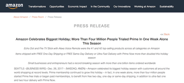 Amazonが2017年12月26日、今シーズンのホリデーシーズンのセールスの概況を発表した。