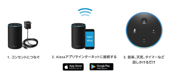 Amazon Echoを購入するとまずスマートフォン向け(iOS版、Android版)のAmazon Alexaアプリをインストールする必要がある。このアプリの指示に従いながらセットアップを行うのだ。