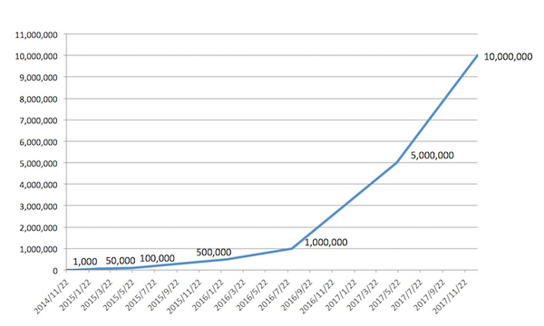 Alexaを使うAndroidユーザーに最低でも1,000万ダウンロードされており、2017年8月以降アプリインストール数が急増しているのがわかる。