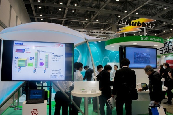 e-ラバーは、通電することで伸縮するゴム素材。この「eラバー」をハンド部分で採用しているのが、コンセプトモデルのソフトアームロボットだ。通常のモーターを使い、物を軽く掴んだあとに、この伸縮性のある「e-ラバー」に電気を通すことでゴムが伸びる。それによりガッチリと物を握ることができる。