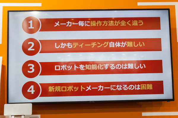 ステージでは同社が考える「産業用ロボットが普及しない課題」として、メーカーごとに操作方法が異なる、ティーチングが難しい、ロボットの知能化が難しい、新規ロボットメーカーになるのが困難、という4点をあげた。