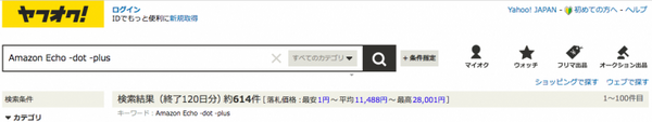 ここで本日(1月23日)時点でのAmazon Echo、Amazon Echo Dot、Amazon Echo Plusの落札相場をそれぞれ調べてみた。