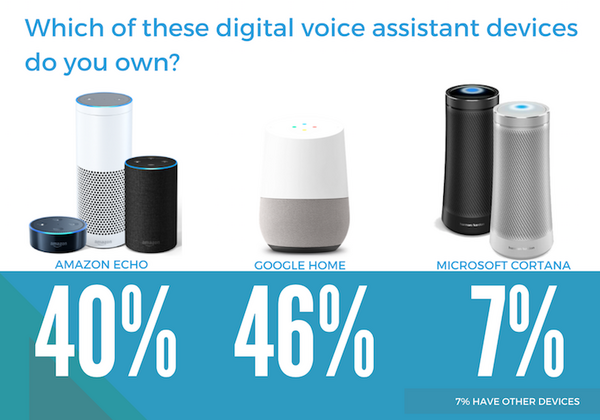 所有しているスマートスピーカーは、Google Home 46%、Amazon Alexa 40%、Microsoft Cortana 7%、その他 7%と続いた。データ数は大きくないが、GoogleがAmazonのシェアを越しているのには驚きだ。