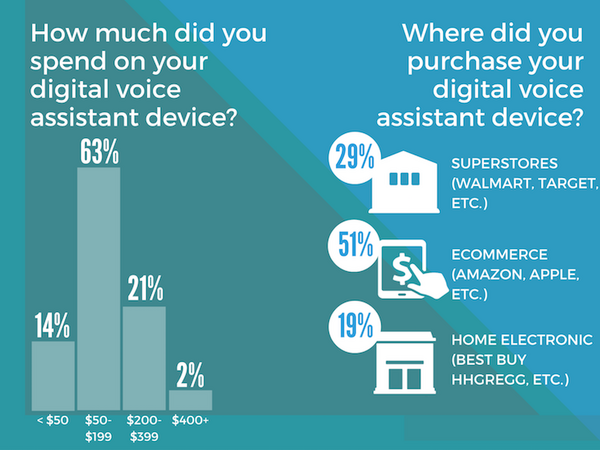 スマートスピーカーの購入金額は50~199ドルが過半数を占めた。ハイエンドモデルとなる400ドル超はわずか2%。低価格モデルだけが売れているということではなく、むしろ14%と少なくミドルレンジが売れていることがわかる。