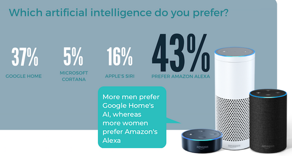 どのAIが好きかを尋ねると、Amazon Alexaが43%、Google Assitantが37%、Apple Siriが16%となった。なお結果には性差が見られ、男性はGoogle Assistant、女性はAmazon Alexaを好むという結果になったという。
