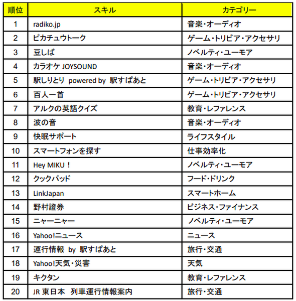 2018年1月の上位5スキルは、2017年12月と変わらず、1位が「radiko.jp」、2位に「ピカチュウトーク」、3位に「豆しば」、4位に「カラオケJOYSOUND」、5位に「駅しりとり powered by 駅すぱあと」となった。一方で、1月の顕著な動向として、百人一首スキルが先月の18位から6位へと大幅に上昇したことがあげられる。このスキルの人気上昇により、Alexaが詠み手となって、家族や友人と百人一首の腕を競い合ったり、一人で練習を行ったりといった新しい百人一首の光景が今年のお正月に展開されたと推測されている。