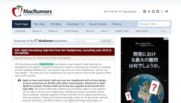 その予測によれば、AirPodsの次期モデルと同時にハイエンドのオーバーイヤータイプのヘッドホンの開発にも取り組んでおり、2018年第4四半期に登場するという。