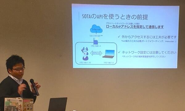 最後に登壇したのは、NTT東日本の山田遼氏。「ロボコネクトのSota APIを使ってみよう」というテーマで技術的な解説を行った。