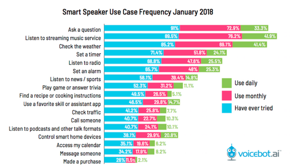 2018年3月18日、米国Voicebot.aiが「SMART SPEAKER CONSUMER ADOPTION REPORT MARCH 2018」を発表した。2018年1月での米国のスマートスピーカー市場の状況が細かく調査された内容となっている。