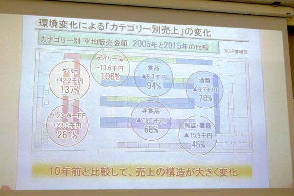 コンビニは昔は若者が使う店だったが、今はもう客層が変化している。そのため、品揃えもこの10年で大きく変化している。パウチ惣菜などが増えた。昔はスーパーで買っていたものもコンビニで買う動きが増えている。当然、売り上げ構成も店舗内のレイアウトも変わっている。