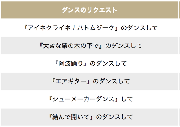 こちらは、ロボホンがダンスを踊る時のセリフで使われているダンス名です。「アイネクライネナハトムジーク」と「アイネ・クライネ・ナハトムジーク」など、よくみるとちょっとだけ違うのがわかるでしょうか。