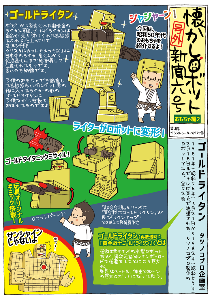 がみの懐かしロボット新聞は、おもちゃ・ゲーム・映画・アニメなどで活躍した、今は懐かしいロボットたちを紹介していく新聞形式のマンガです。→ がみの懐かしロボット新聞スマホの方はタップで拡大できるようになります次回の更新は3月27日を予定しています。