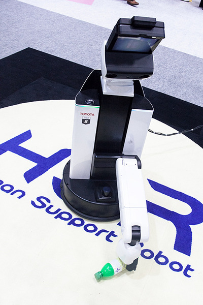 床に落ちたペットボトルを拾い上げるロボット「HSR」