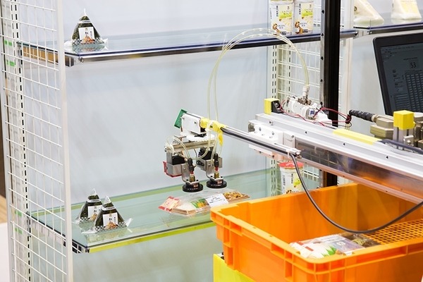 商品棚におにぎりや弁当、サンドイッチを並べるロボット