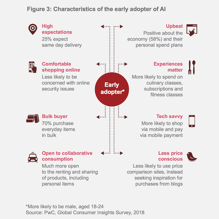 現時点でAIデバイスを所有しているユーザープロファイルは、18~34歳の男性で、即日配達を求める、オンラインセキュリティの問題に関心を持たない、まとめ買いが好き、レンタル・共有に寛容、経験に価値を見出す、ハイテクに精通した、価格ではなくブログで購入を決めるといった傾向があるという。