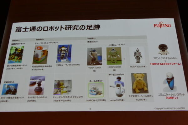 原氏はまず「Iotやサービスを繋げて価値を生み出す。世の中に対して制御するためにはIoTやロボットが必要だ」と述べた。富士通は長年、AIやロボット関連の研究開発を続けてきている。