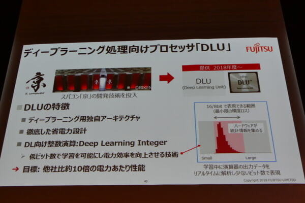 ディープラーニングはリソースが必要だ。富士通は理研、産総研にそれぞれ計算機を納品している。またエッジサイドでも高速動作できるようにチップ「DLU」も開発している。